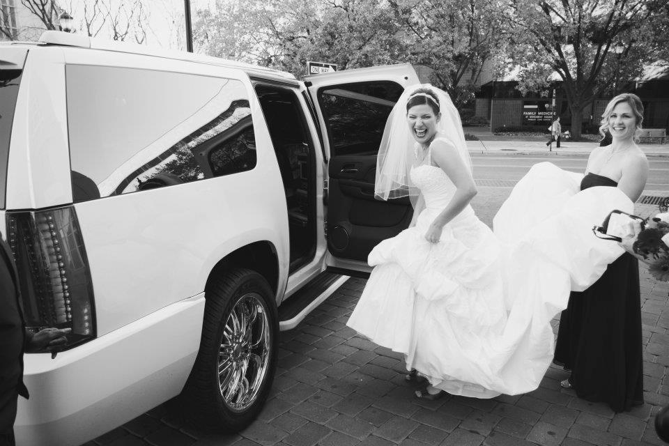 Once my hair was finished, we raced to my parents' house to pick up my dress and the rest of my caravan! Here we are en route! Wearing my DIY puffy painted Mrs. Hunter jacket :)